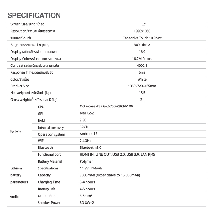• จอภาพระบบสัมผัส ลื่นไหล ตอบสนองแม่นยำพร้อมระบบปฏิบัติการ Android OS มีล้อเลื่อน เคลื่อนย้ายสะดวก มีแบตเตอรี่ในตัวใช้งานได้ทุกที่